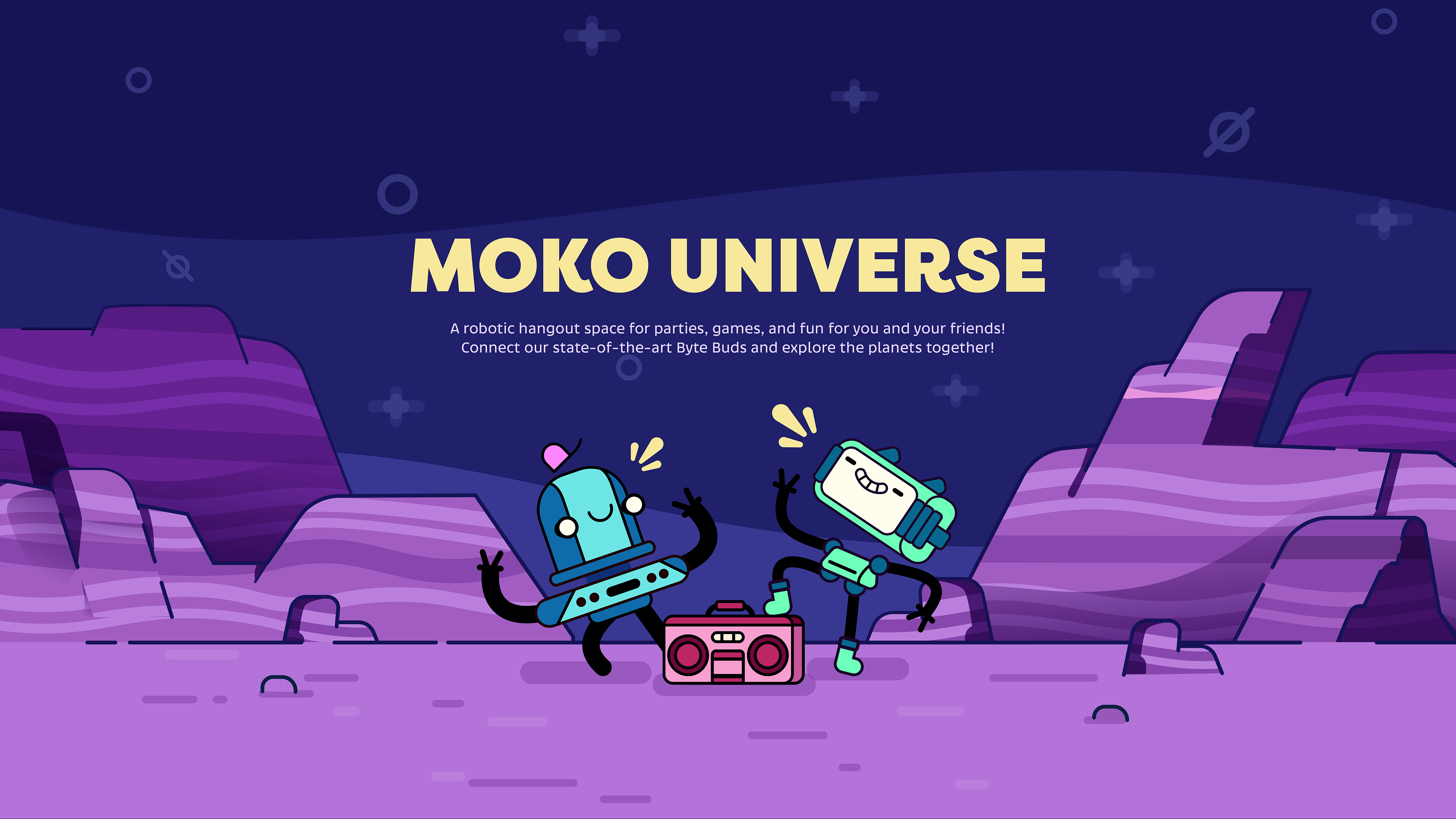 concept: moko universe is an online social room where kids can invite up to 12 of their friends to a space-themed environment using unique robot avatars we call Byte Buds to connect and talk!